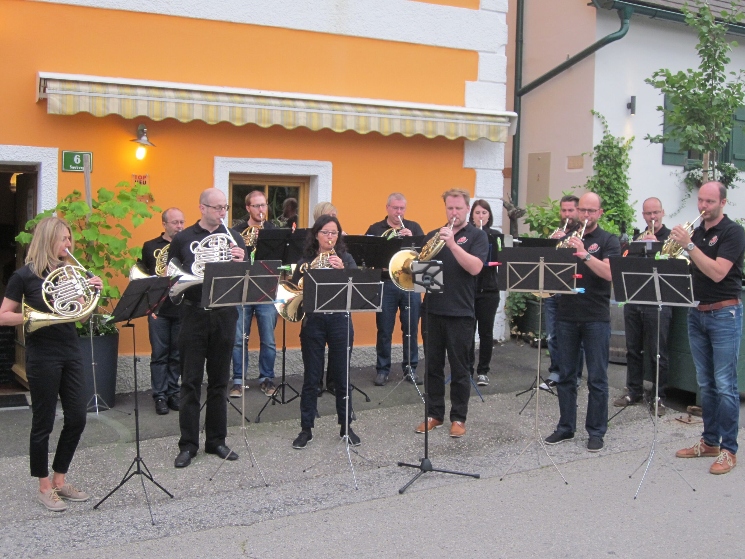 Nach einer intensiven Nachtzugreise kam der Grossteil der Schwyzer Hornistinnen und Hornisten frühmorgens in St. Pölten an und überbrückte die Zeit bis die Kleinbusse gemietet waren mit einem zünftigen zweiten Frühstück. So gestärkt begaben sie sich dann auf die kurze Busfahrt nach Langenlois ins Hotel Vierzigerhof, wo auch gleich die erste Probe anstand; man ist schliesslich (auch) auf einer Musikreise.